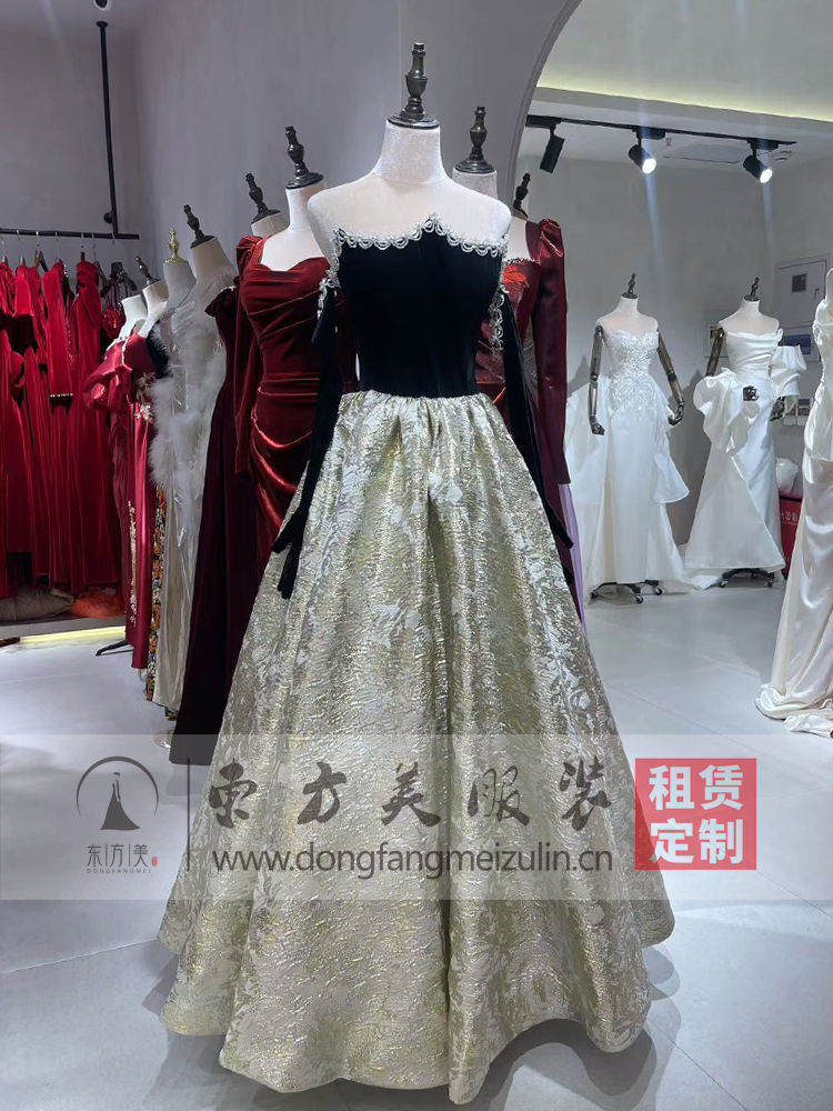 高级黑色金色丝绒抹胸年会晚宴主持人晚礼服租赁