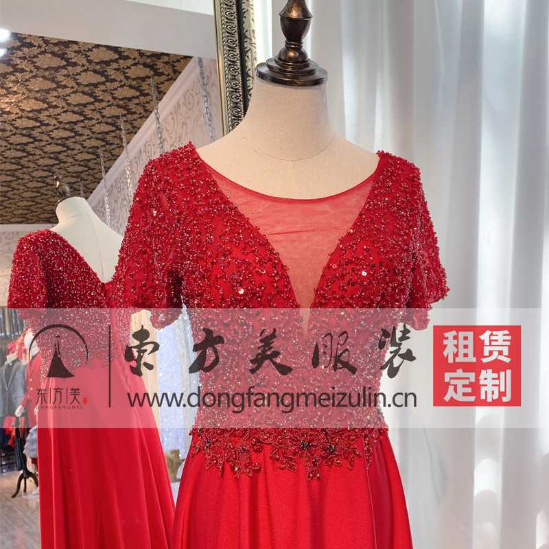 红色深V亮珠小袖 高级晚礼服 年会礼服主持人礼服