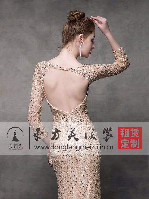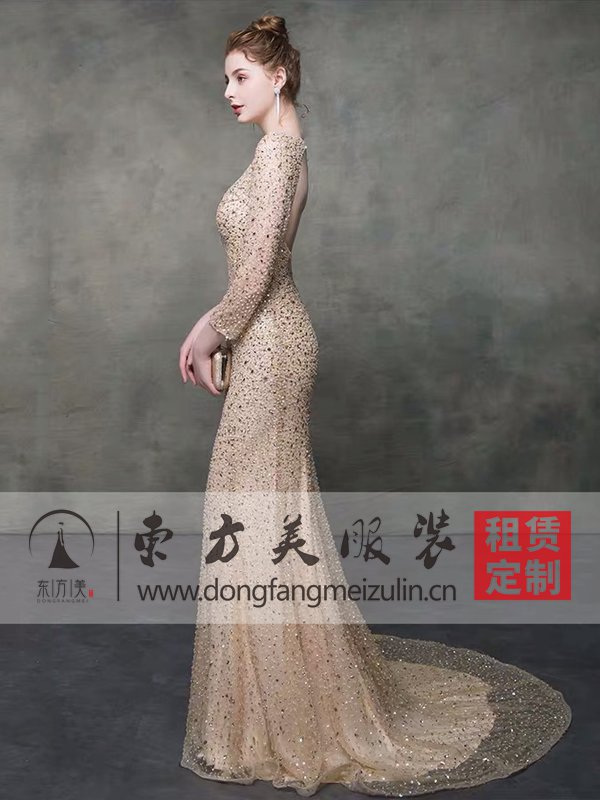 金色重手工鱼尾长袖年会 主持人 走秀 晚宴精品礼服