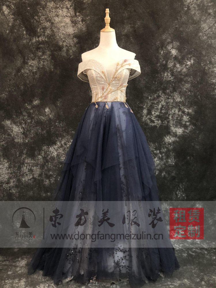金色V领一字肩年会主持人礼服 酒会 晚宴 走秀礼服租赁