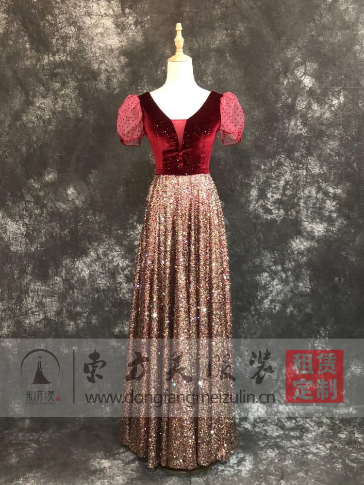 红色丝绒短袖年会主持人礼服 酒会 晚宴 走秀礼服租赁