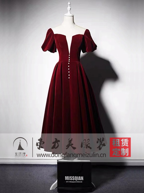 酒红色泡泡袖丝绒中长款年会 晚宴 走秀礼服